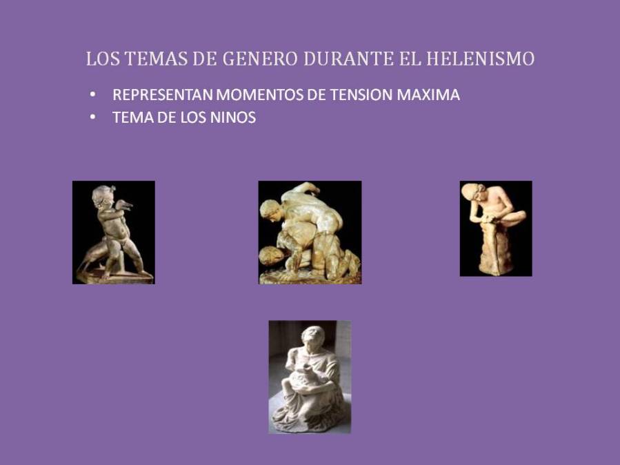 Se van a desarrollar mucho durante el helenismo. Como ejemplos El niño de la oca, los Luchadores (escena de gimnasio que capta el momento de tensión máxima), la Vieja ebria (en la que no encontramos ya ni rastro de la belleza ideal), el Espinario (niño quitándose una espina después de una prueba deportiva, el tema de los niños tuvo mucho éxito en este período) o el Hermafrodita tumbado.