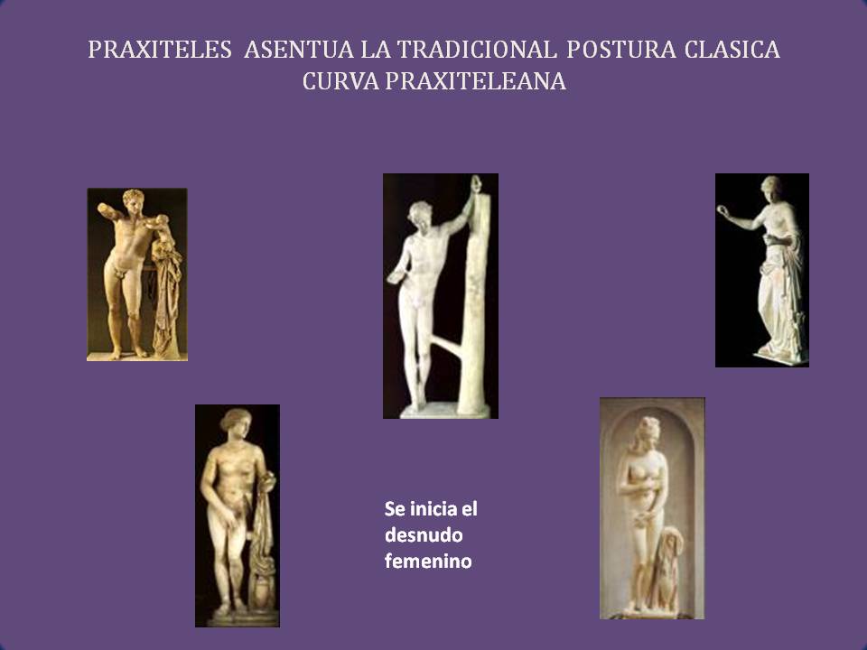 • La Afrodita de Cnido (con la que se inicia el desnudo femenino, todavía «timidez», siente pudor y se cubre con las manos, será muy copiada, canon de belleza femenina)