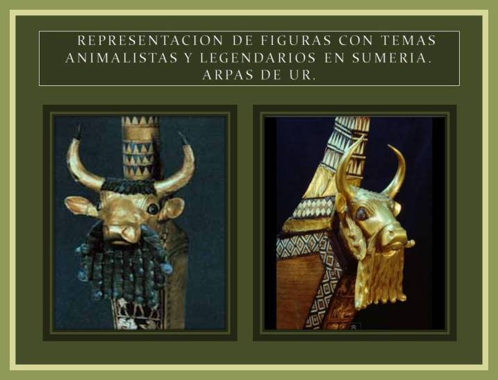 La escultura que representa un toro se utilizo con el propósito de decorar un arpa encontrada en la tumba de Paubi y que data de alrededor del 2600 A.C exhibe una riqueza de elementos decorativos sorprendentes. Esta realizada en oro y lapislázuli.