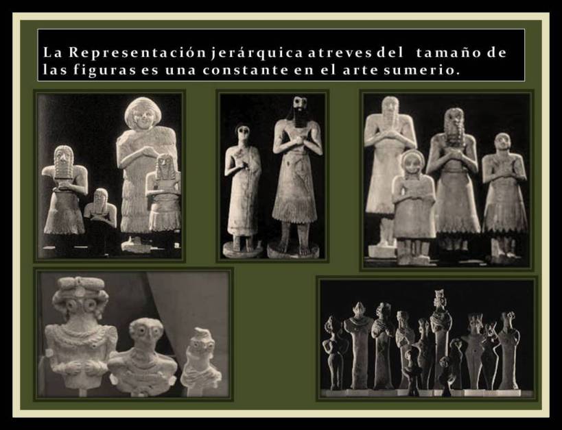 Es de destacar el hecho de la representación jerárquica atreves del  tamaño de las figuras, estas van por orden de importancia desde los dioses hasta los adoradores. Y este elemento se muestra tanto en el periodo temprano como en los subsiguientes manteniéndose como una constante en el arte sumerio que incluso para a otras culturas con los que tuvieron contacto o a las que pasaron esta fórmula por herencia.