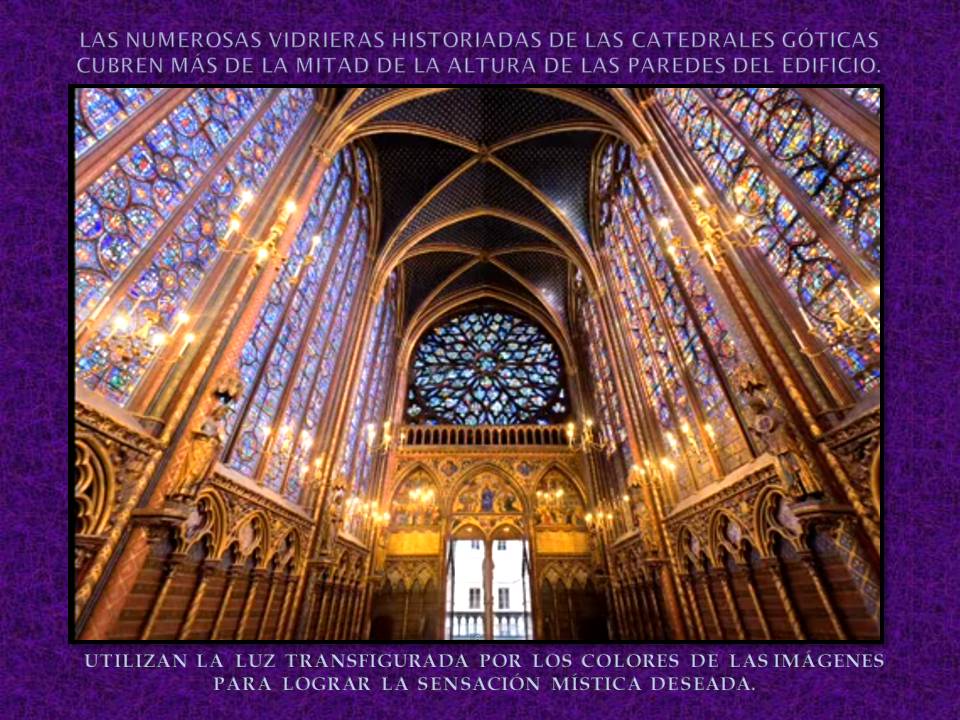–           Los vitrales historiados sustituyen la tradicional decoración hecha en frescos de los extensos muros de las iglesias románicas. Búsqueda de la verticalidad para acercarse a Dios en la arquitectura.