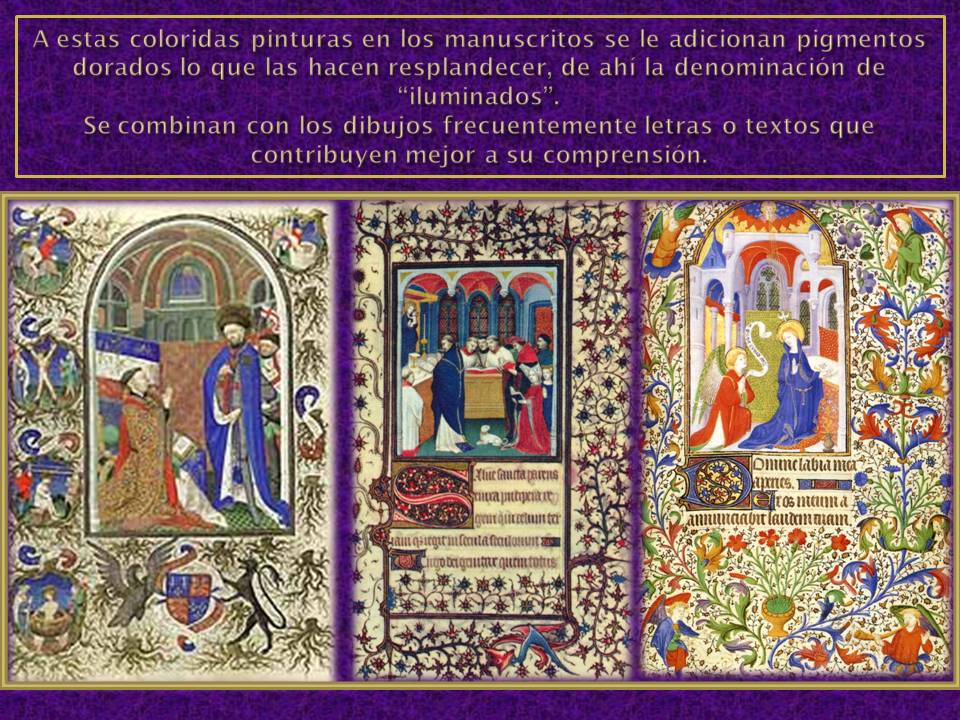 Aunque inicialmente los manuscritos eran solo realizados por monjes, posteriormente se incorporan a la realización  artística de las mismas artistas y personas que dominaban la técnica que eran pagados por estos trabajos entre los cuales se encuentran mujeres. A estas pinturas en los manuscritos se le adicionan pigmentos dorados lo que las hacen resplandecer, de ahí la denominación de “iluminados”. Se combinan con los dibujos frecuentemente letras o textos que contribuyen mejor a su comprensión y se diferencian de los manuscritos románicos en el mejor manejo del detalle de las figuras que muestran que estos artistas conocen mejor ya sobre la anatomía de hombres y animales.