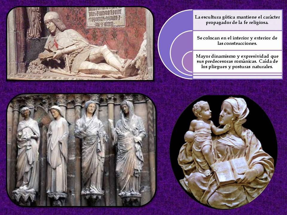 –          Mantiene el carácter de propaganda de la fe pero ahora los santos, vírgenes /ángeles muestran paulatinamente expresividad, dinamismo y volumen que las diferencia de esculturas románicas.