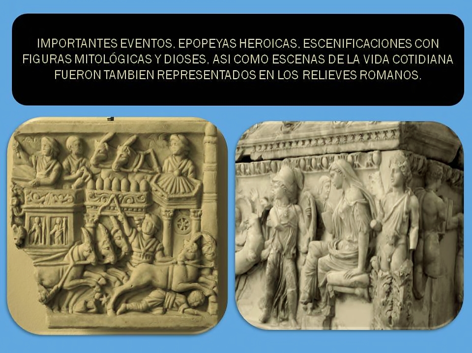 En la forma en que se representan los relieves decorativos y narrativos en las edificaciones en la antigua Roma se puede apreciar que constituyen relatos históricos romanos hechos en piedra. Estos relieves aportan información significativa sobre muchos aspectos relativos a la vida social, religiosa, política, militar y económica de esta ciudad y las regiones conquistadas. Roma llego a ser centro de un gran imperio que aglutinó diferentes culturas bajo su poder militar e influencia cultural por lo que aplican también en sus territorios la técnica del relieve; como lo hicieran anónimos artesanos en Roma para decorar estructuras arquitectónicas como monumentos, columnas conmemorativas y panteones funerarios.