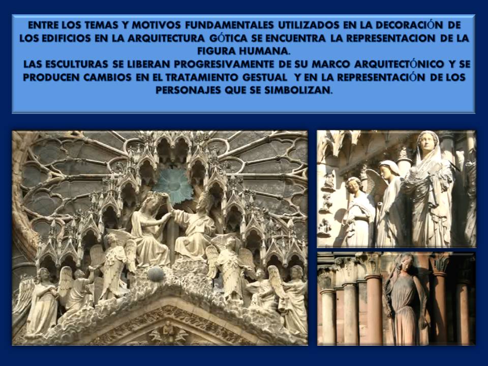 En el periodo Gótico las esculturas se liberan progresivamente de su marco arquitectónico y se producen cambios en el tratamiento gestual y en la representación de los personajes que se simbolizan. En los tímpanos de las fachadas aparecen relieves y esculturas con el tema del Cristo resucitado y triunfante, el tema mariano y escenas del antiguo y nuevo testamento.