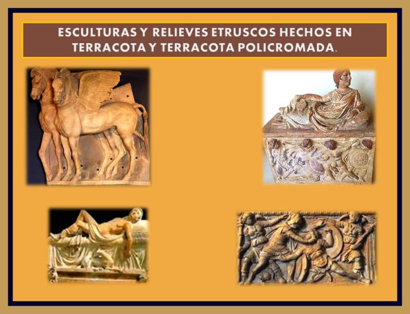 Los etruscos no utilizaron el mármol a pesar de su influencia griega en sus producciones escultóricas, sin embargo la terracota y las piedras locales fueron ampliamente utilizadas sobre todo para la elaboración de bajos relieves, esculturas funerarias así como religiosas para decoración de templos. Se producían esculturas también para la decoración de las casas de las personas acaudaladas que podían costearlas.