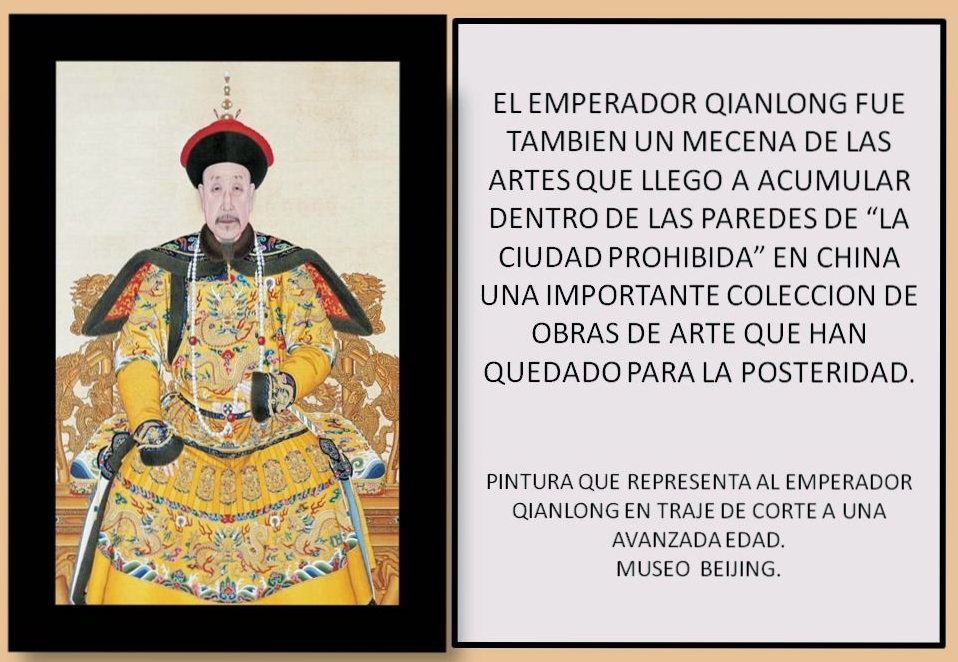 Hay otro importante mecenas el emperador Qianlong en China que fue un gran coleccionista y adquirió el mismo gran parte de las «Grandes colecciones» de China por cualquier medio necesario, reintegrando estos tesoros en la colección imperial a la que prodigaba sus esfuerzos y atención como curador, recopilando cuidadosamente pinturas raras y antigüedades, utilizo un equipo de asesores culturales que lo ayudaban. A veces, Qianlong presionó o incluso obligo a ricos cortesanos a darle objetos de arte de valor señalando fallas en su trabajo, las que podrían ser disculpadas si hicieran un cierto «regalo», o persuadiendo a los orgullosos propietarios de esas piezas que sólo las paredes de la «ciudad prohibida» y sus guardianes ofrecerían la seguridad y protección contra robo o incendio. Estas tácticas no son exclusivas de Qianlong puesto que muchos reyes y personalidades adineradas a lo largo de la historia de la humanidad acumularon gran cantidad de obras de arte comprándolas o por otros métodos no tan claros o legítimos.